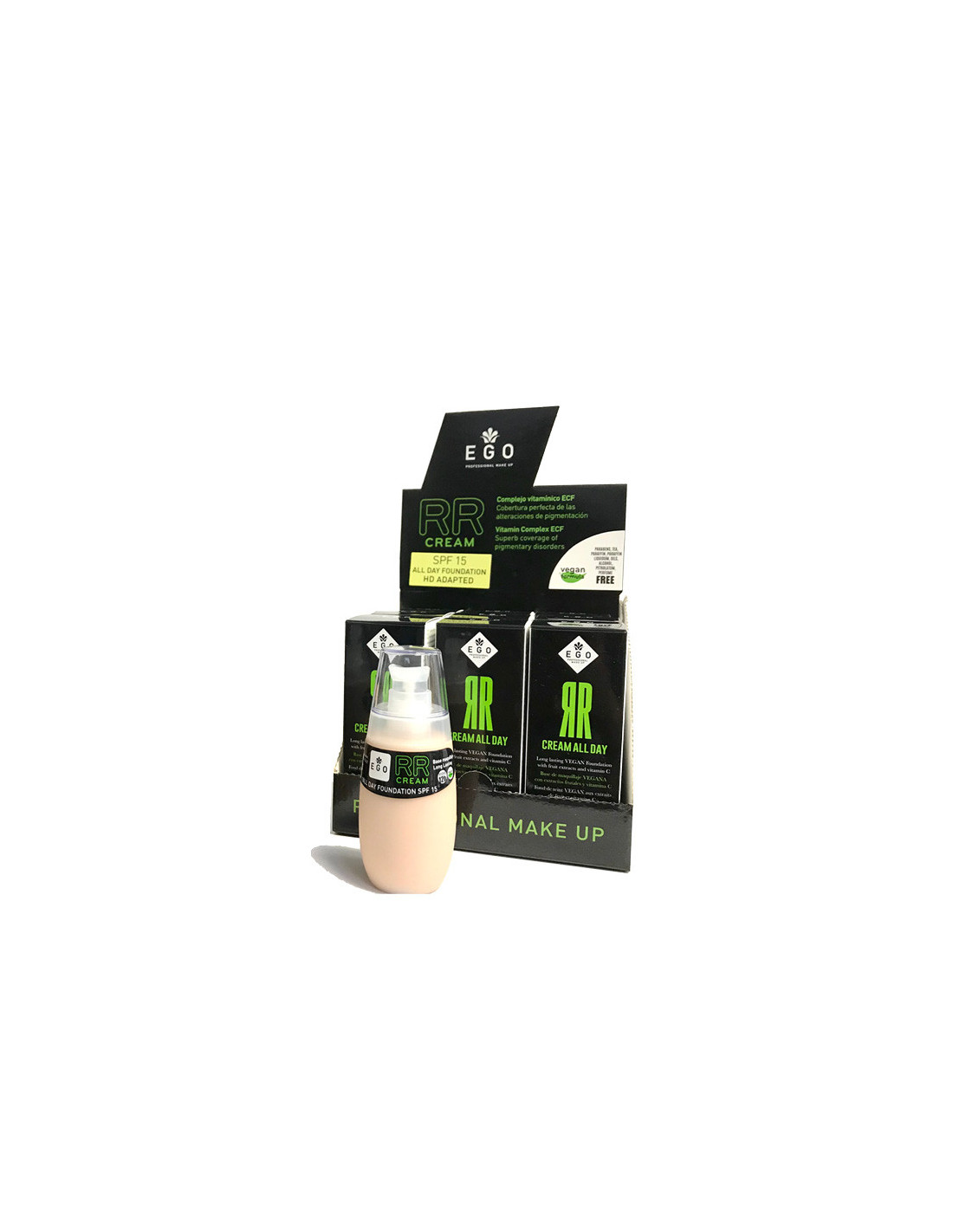 Expositor de 9 RR Cream con 1 tester incluido. Base vegana con vitamina C, extractos frutales y SPF 15. Cobertura perfecta, acabado mate aterciopelado y hasta 12 horas de duración. Disponible en 2 tonos (indicar tonos en observaciones).