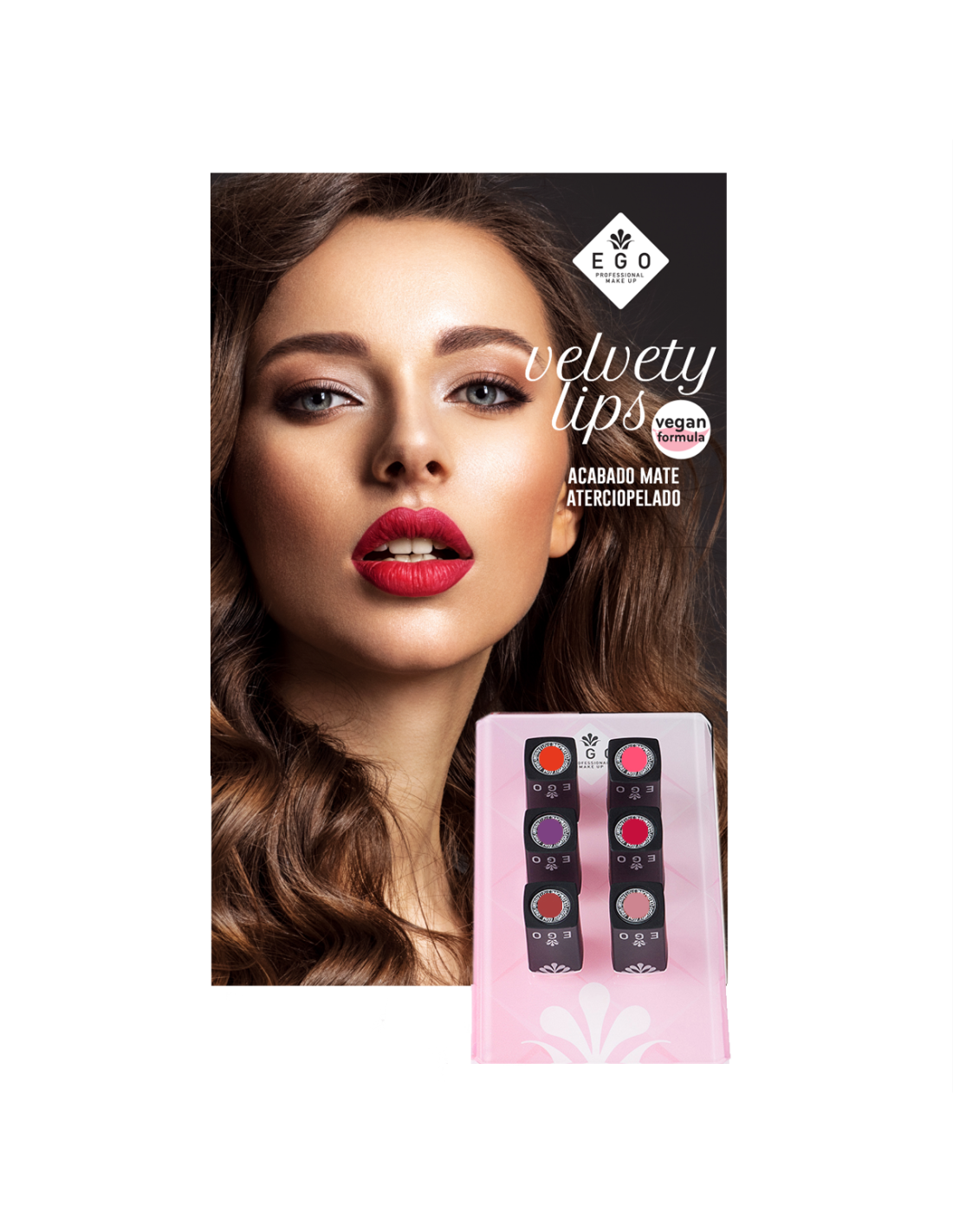 Expositor de labiales Velvety con 3 unidades por color (6 colores) y 6 testers de obsequio. Labial vegano de alta cobertura con acabado mate aterciopelado, textura cremosa y colores duraderos y elegantes.