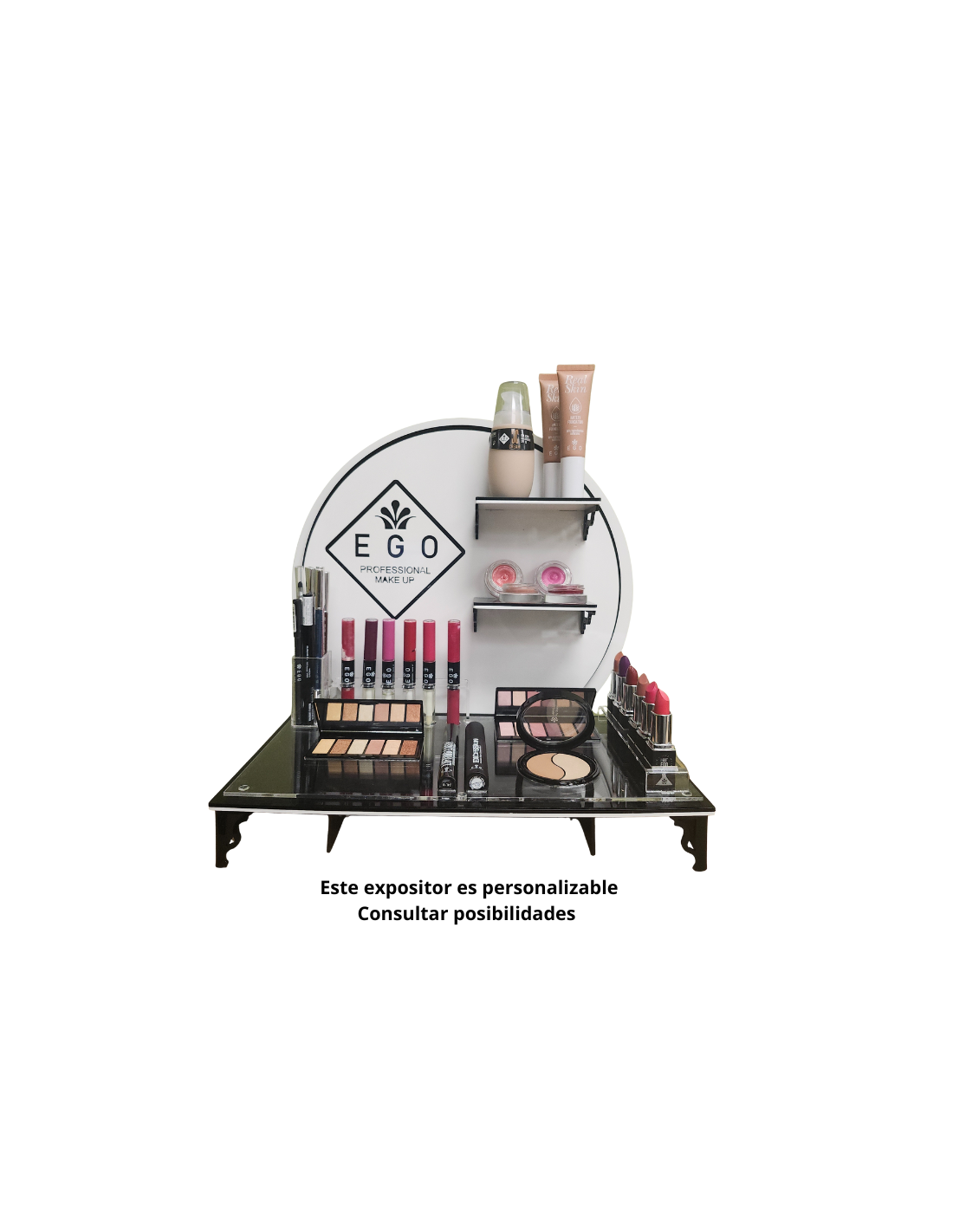 Este expositor circular es la forma perfecta de poner al día tu salón y embellecer tu espacio de trabajo. Incluye una amplia selección de productos esenciales de maquillaje y cuidado, organizada de forma práctica y lista para exhibir: paletas, bases, coloretes, máscaras, labiales, perfiladores y polvos compactos. Además, incluye 1 tester por referencia y vinilo promocional, junto con una manta de 7 pinceles Ego, facilitando la prueba de producto y potenciando la venta.