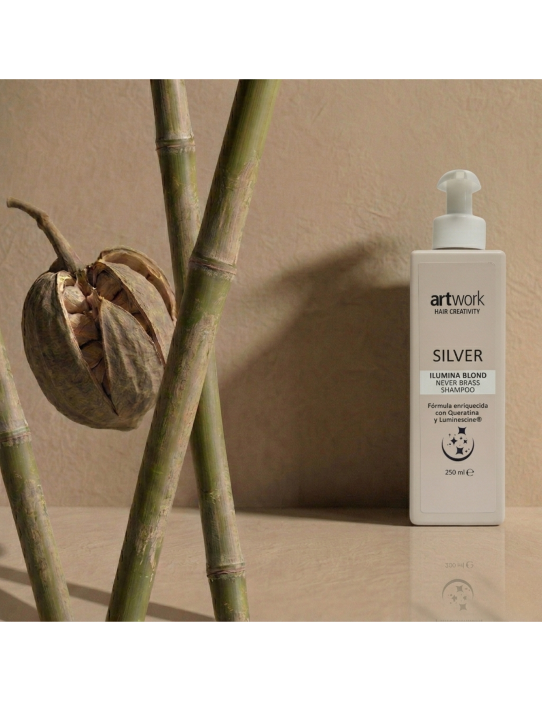 El Shampoo SILVER (250 ml) es ideal para cabellos claros que necesitan matizar los tonos amarillos no deseados y recuperar brillo. Su pigmento violeta neutraliza los reflejos amarillos mientras Luminescine y Queratina fortalecen la fibra capilar y aportan suavidad y luminosidad sin apelmazar.